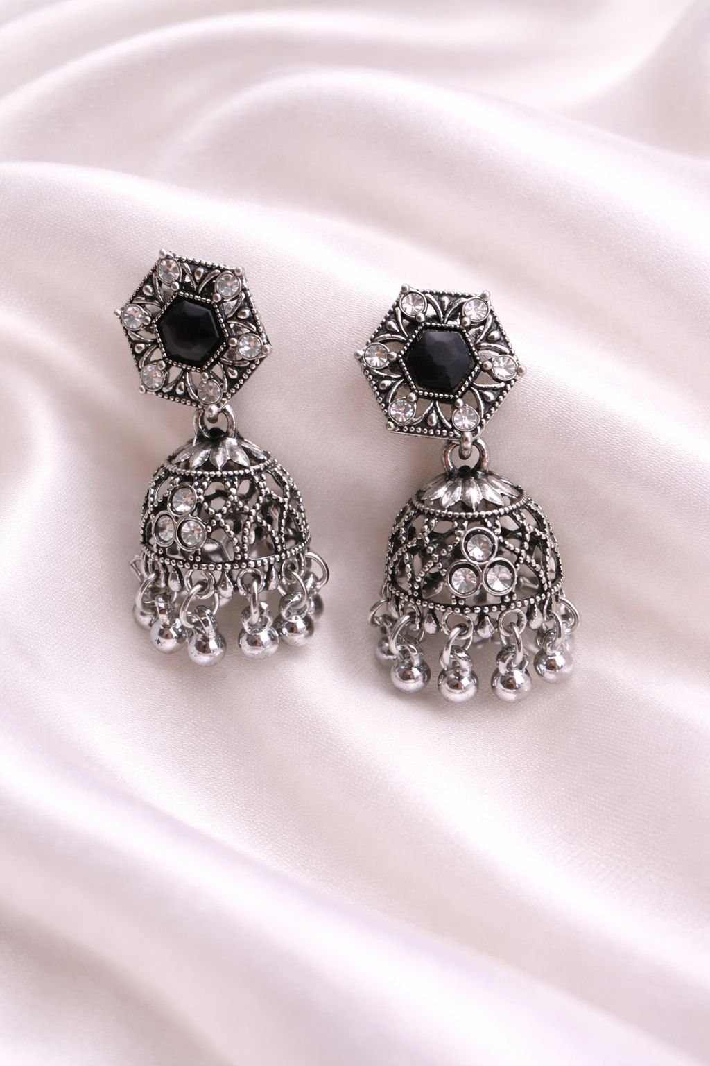 Make a bold style statement with these elegant black stone oxidized designer jhumka earrings. Featuring a beautifully detailed hexagonal stud with a deep black stone centerpiece, these earrings are paired with an intricately carved oxidized dome and delicate metallic bead drops. The antique finish enhances the traditional craftsmanship, making it a perfect choice for festive occasions, ethnic wear, and statement styling.