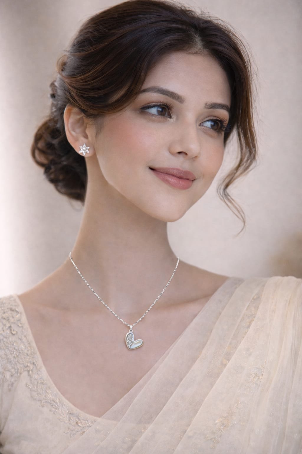 This 925 Sterling Silver Heart Pendant Chain is a perfect blend of elegance and simplicity. Designed with a delicate heart-shaped pendant embellished with sparkling cubic zirconia stones, this chain adds a soft and graceful charm to your look. Lightweight and comfortable, it is ideal for everyday wear as well as special occasions. Pair it effortlessly with ethnic or western outfits for a timeless and classy appeal.