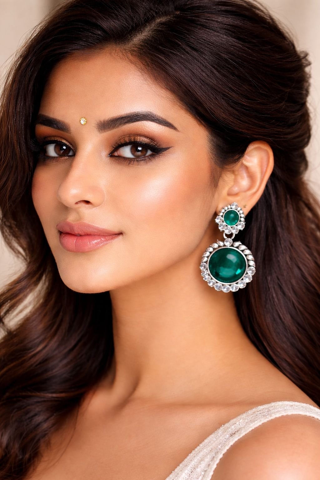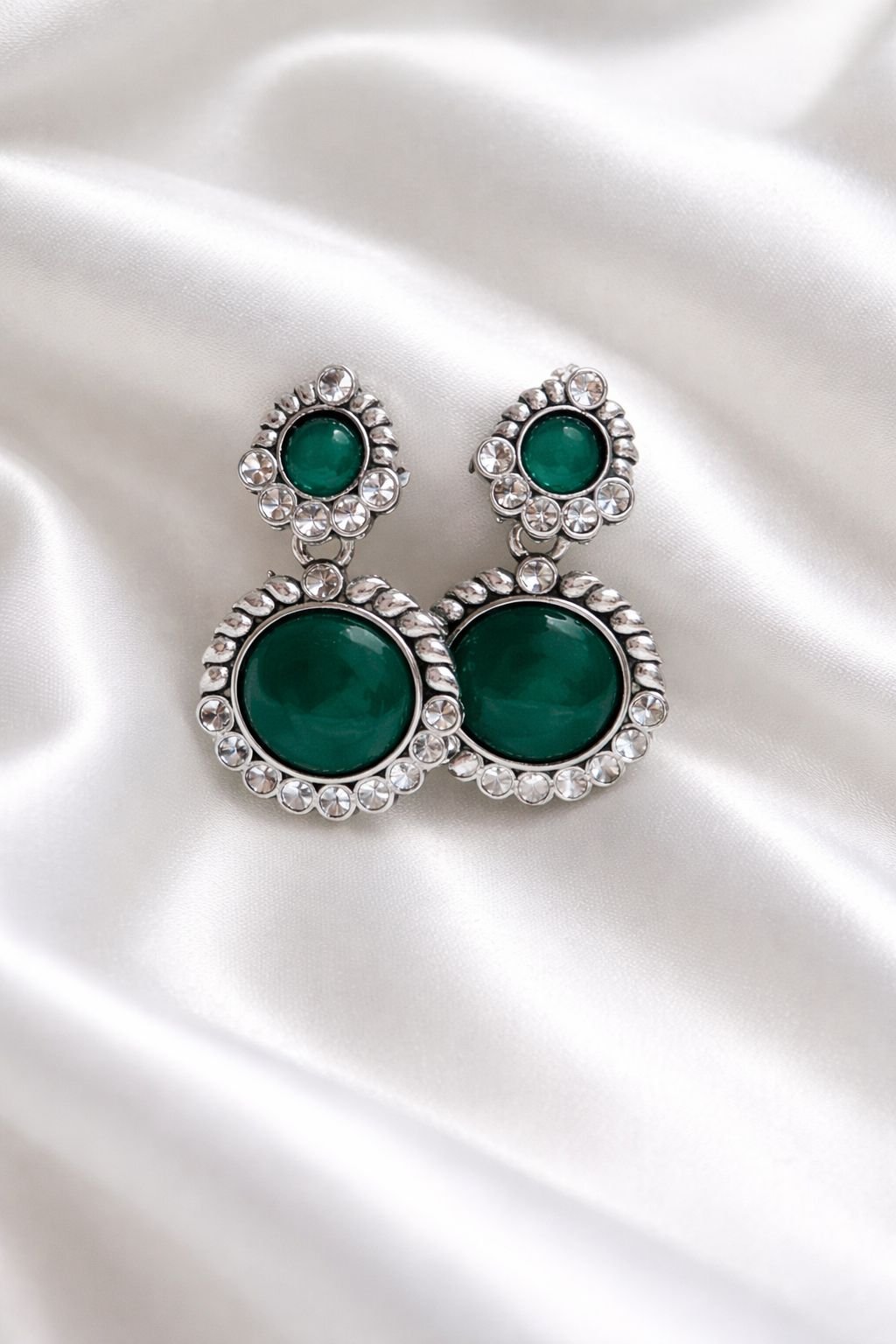 Turn heads with these stunning emerald green crystal statement earrings. Designed with a rich green stone centerpiece surrounded by sparkling crystal embellishments, these earrings bring a luxurious and elegant touch to your look. The double-drop design adds graceful movement, making them perfect for parties, weddings, and special occasions. A perfect blend of glamour and sophistication for modern women.