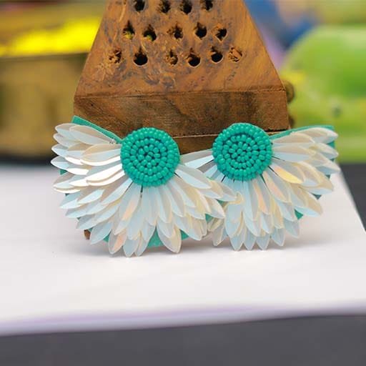 Make a graceful statement with these beautifully designed Floral Statement Earrings from Kiyana Collections. Featuring a mint green textured center surrounded by delicate white petal-shaped layers, these earrings bring a fresh and elegant charm to your look. Lightweight yet eye-catching, they are perfect for festive occasions, daytime events, and modern ethnic styling, pairing effortlessly with sarees, lehengas, and fusion outfits.