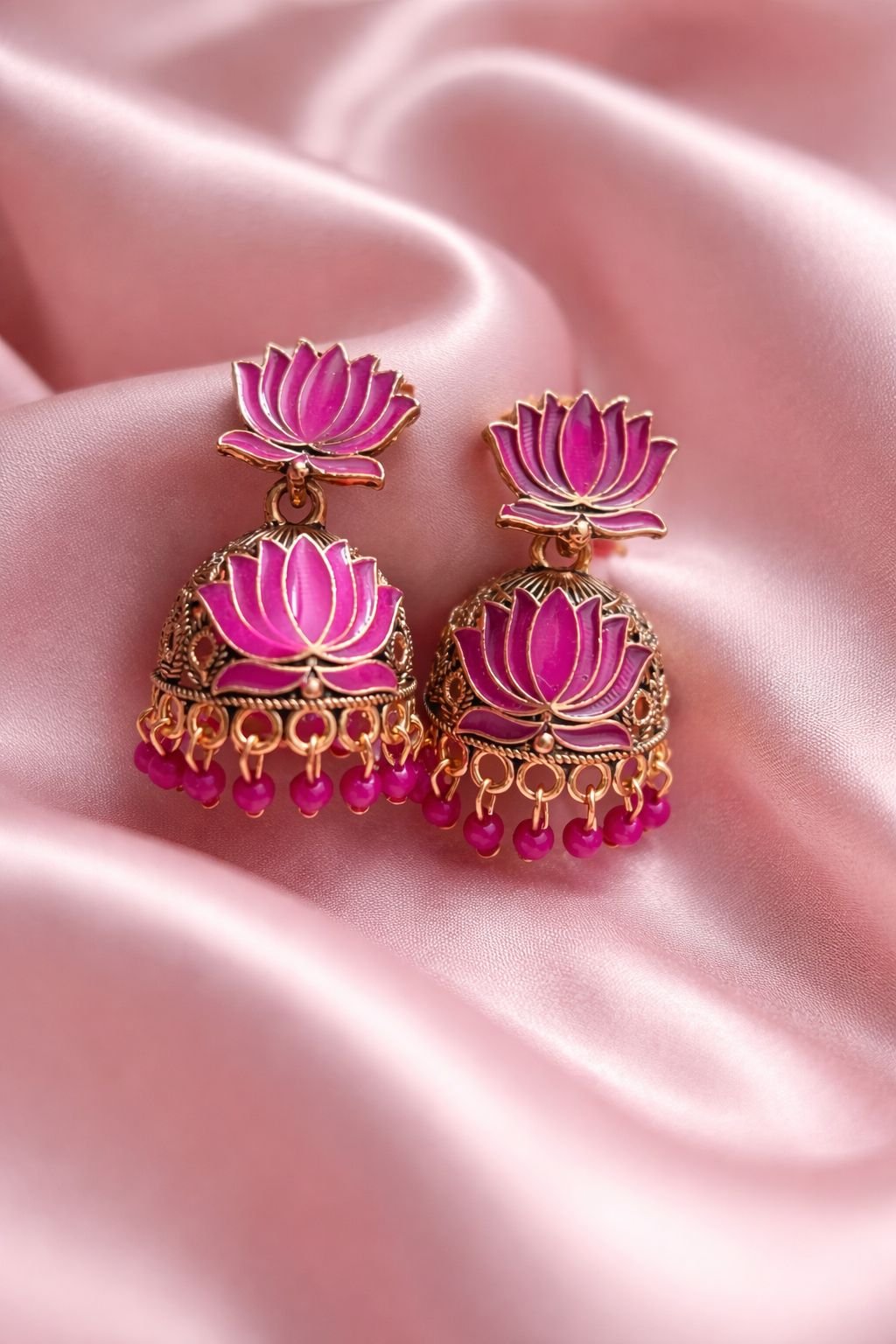 Enhance your ethnic elegance with these stunning pink lotus designer jhumka earrings. Featuring a beautifully crafted lotus motif in vibrant pink enamel, paired with an intricately detailed gold dome and delicate bead drops, these earrings exude traditional charm with a modern touch. Perfect for weddings, festive occasions, and special celebrations, they make a bold yet graceful statement.