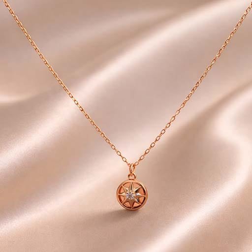 This 925 Sterling Silver Star Pendant Chain features a beautifully crafted compass-inspired star design, finished in an elegant rose gold tone. Accented with sparkling cubic zirconia stones, the pendant adds a refined and graceful touch to any outfit. Lightweight and comfortable, this chain is perfect for everyday wear as well as special occasions. A timeless piece that pairs effortlessly with both ethnic and western attire.